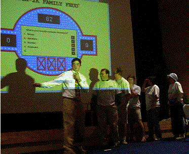 In the CF Family Feud, Michael and company had polled registrants in the weeks before to answer several questions (technical and non-work related) to gather the most popular answers for each. Questions such as what hour do you get to work, what is the most popular CF tag and what do you say to a client when a project is late. As in the real show, two teams of participants, hand-picked by em-cee Chris Mosier (Nashville CFUG) for a balance of skill, strong personalities, and random entertainment value, vied against each other as 2 “families” to pick the most popular answers. Again, the realism in the music, graphics, and Chris's showmanship made for a compelling and entertaining break in the day.